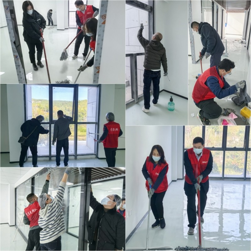 “支部建在項(xiàng)目上、黨旗插在工地上”。國(guó)泰地產(chǎn)黨支部始終堅(jiān)持黨建品牌與工程項(xiàng)目深度融合,項(xiàng)目在哪里黨員先鋒隊(duì)就在哪里。到達(dá)活動(dòng)現(xiàn)場(chǎng)后,黨員先鋒隊(duì)成員和志愿者們主動(dòng)拿起刮刀、塵推、地刷、掃把等10余件清潔工具,按照小組分工協(xié)作,清潔地面、清掃垃圾、擦拭玻璃,井然有序干起來,有的人頭發(fā)里沾滿了灰塵,有的人臉上掛滿了汗珠,有的人汗水濕透了衣衫。大家不嫌臟、不嫌累,熱情高漲,紛紛以為企業(yè)降本增效為榮,樂在其中。