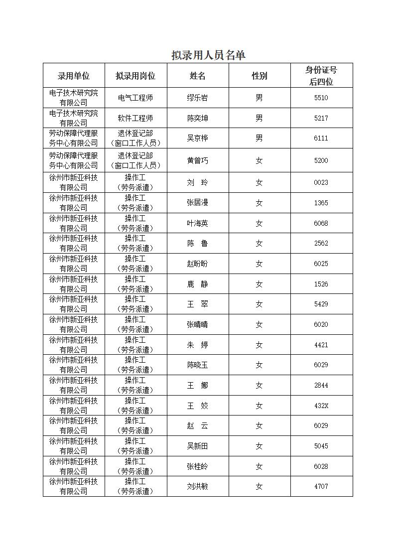 根據(jù)《徐州市國有資產(chǎn)投資經(jīng)營集團(tuán)有限公司招聘工作人員公告》相關(guān)要求,海鷗集團(tuán)所屬電子技術(shù)研究院有限公司、勞動保障代理服務(wù)中心有限公司、徐州市新亞科技有限公司公開招聘工作已經(jīng)完成,現(xiàn)將擬錄用人員名單進(jìn)行公示。公示期自2023年5月6日起至5月11日止。如對公示對象錄用資格有異議,請于公示期內(nèi)向海鷗集團(tuán)組織人事部(紀(jì)檢監(jiān)察室)反映。