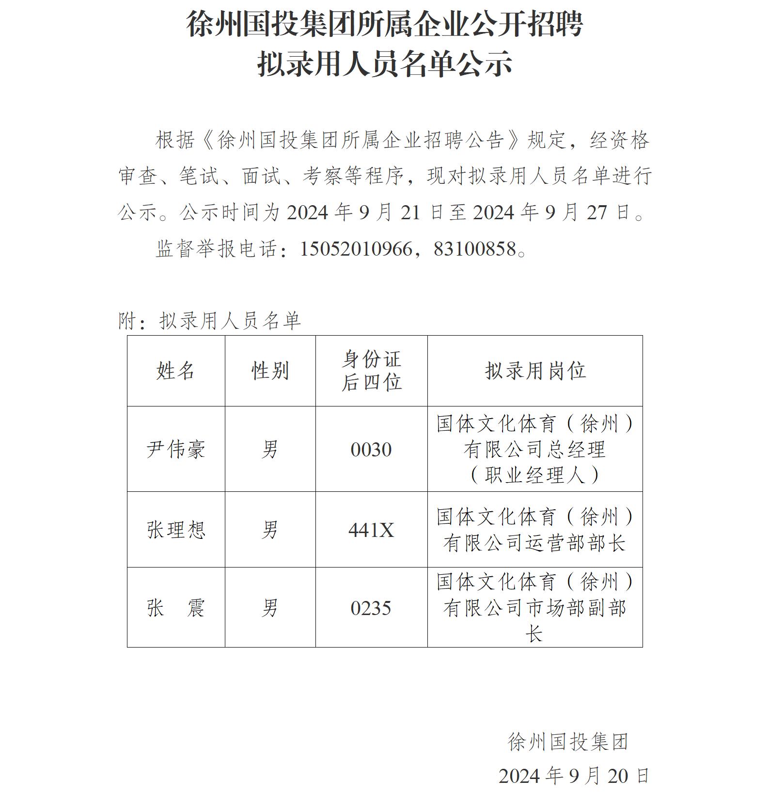 徐州國(guó)投集團(tuán)所屬企業(yè)公開(kāi)招聘擬錄用人員名單公示