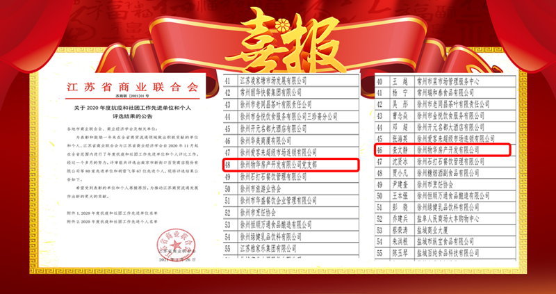 近日,華強(qiáng)黨總支物華黨支部因在2020年度抗擊新冠肺炎疫情工作中表現(xiàn)突出,被江蘇省商業(yè)聯(lián)合會(huì)評(píng)為“江蘇省商業(yè)聯(lián)合會(huì)2020年度抗疫和社團(tuán)工作先進(jìn)單位”,物華黨支部書(shū)記查文靜同志榮獲“抗疫和社團(tuán)工作先進(jìn)個(gè)人”。2020年,物華黨支部在疫情防控工作中充分發(fā)揮基層黨支部戰(zhàn)斗…
