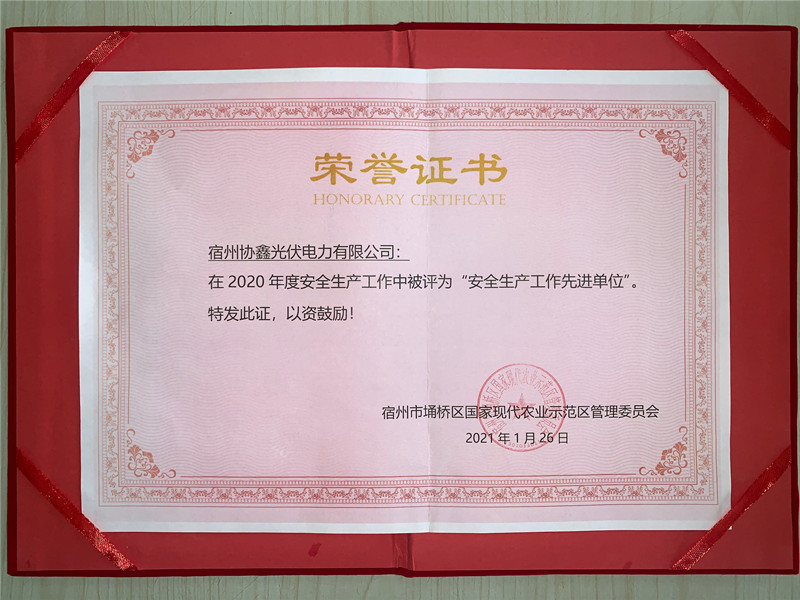 2021年2月1日,在國家現(xiàn)代農(nóng)業(yè)示范區(qū)管委會召開的年度安全工作會議上,管委會對國投環(huán)能公司所屬宿州協(xié)鑫光伏電站2020年度安全生產(chǎn)工作總體情況進(jìn)行通報(bào),對人員持證上崗、安全目標(biāo)責(zé)任書的落實(shí)以及電站各項(xiàng)安全宣貫培訓(xùn)等工作做出高度評價,授予國投環(huán)能公司所屬宿州協(xié)鑫光伏電站2020年度“安全生產(chǎn)工作先進(jìn)單位”榮譽(yù)稱號。