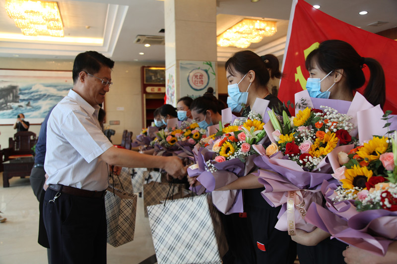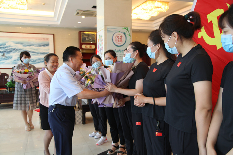 27日早上8點,12名抗疫隊員們穿著貼有國旗標識的統(tǒng)一服裝,高舉著鮮紅的黨旗,懷著激動的心情列隊等候在大廳,李曉東董事長、姜巖總經(jīng)理與她們一一親切握手、問候,親手送上鮮花與禮盒,并與她們合影留念。