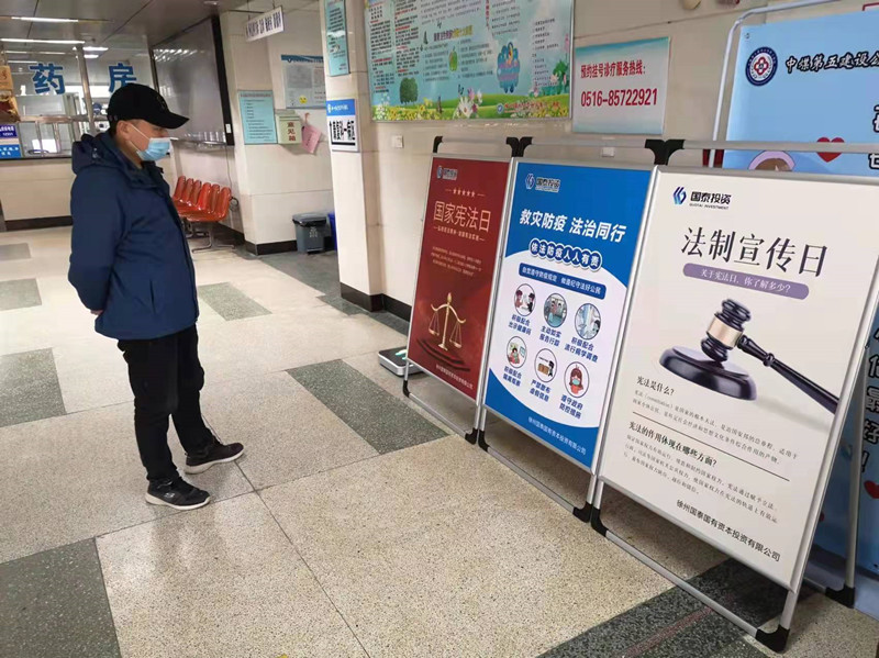 國泰投資公司在所屬公司、醫(yī)院、酒店等人流密集場所布置“法制宣傳”、“憲法宣傳”、“疫情防控宣傳”展板,發(fā)放《憲法普及知識》《傳染病防控法普及知識》折頁進行宣傳。