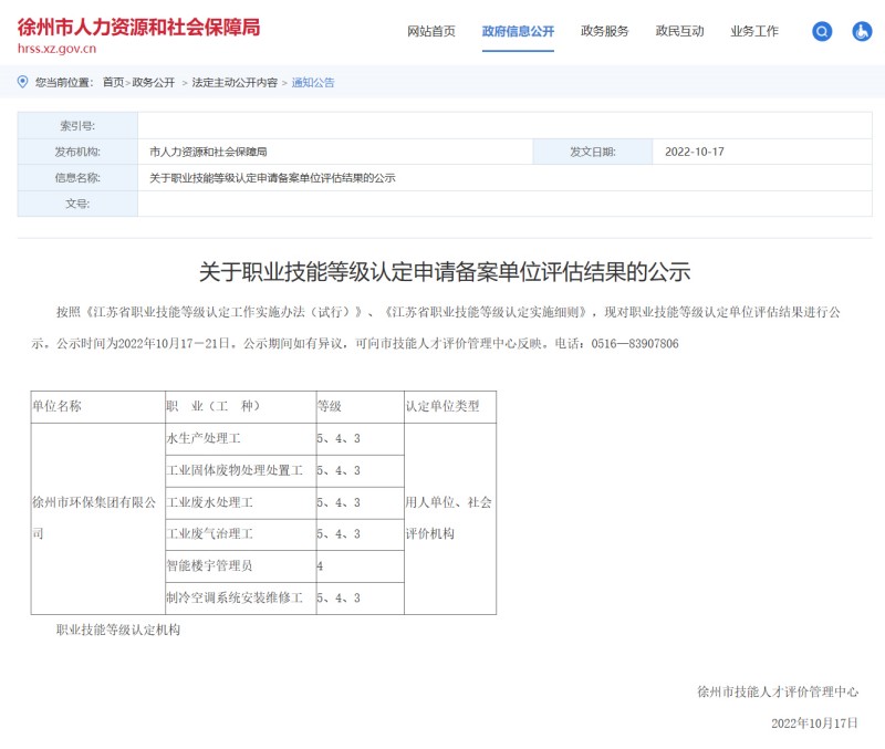徐州市環(huán)保集團(tuán)評(píng)價(jià)中心通過徐州市人力資源和社會(huì)保障局審批。按照《江蘇省職業(yè)技能等級(jí)認(rèn)定工作實(shí)施辦法(試行)》《江蘇省職業(yè)技能等級(jí)認(rèn)定實(shí)施細(xì)則》,徐州市環(huán)保集團(tuán)有限公司成為水生產(chǎn)處理工、工業(yè)固體廢物處理處置工、工業(yè)廢水處理工、工業(yè)廢氣治理工、制冷空調(diào)系統(tǒng)安裝維修工的5、4、3級(jí)以及智能樓宇管理員4級(jí)的職業(yè)技能等級(jí)認(rèn)定機(jī)構(gòu)。